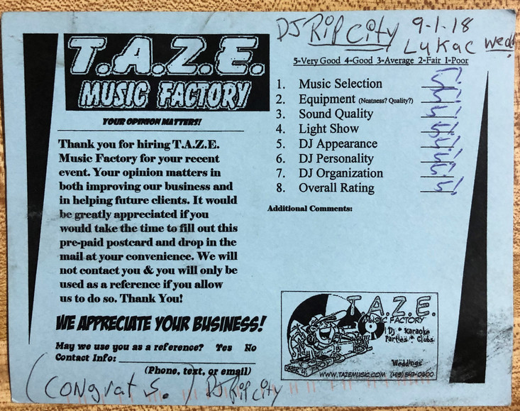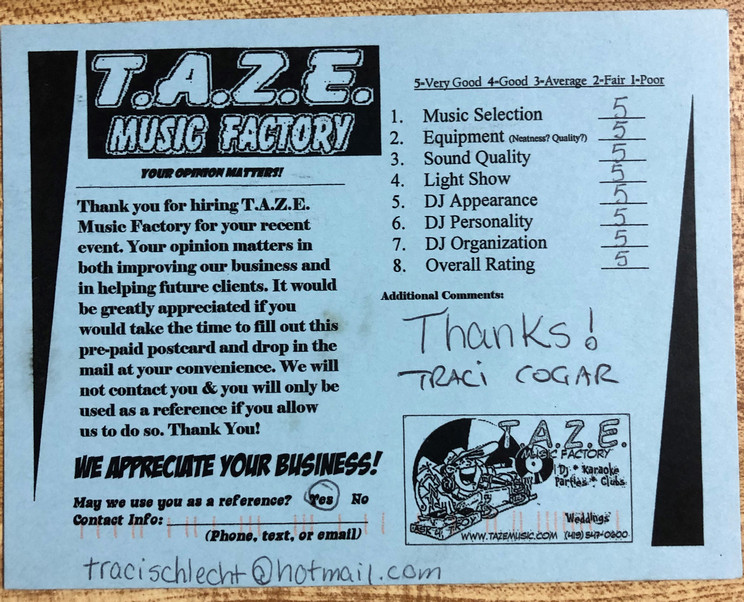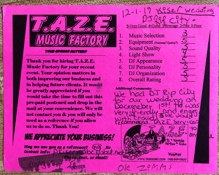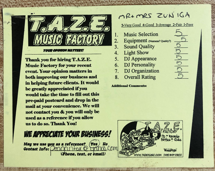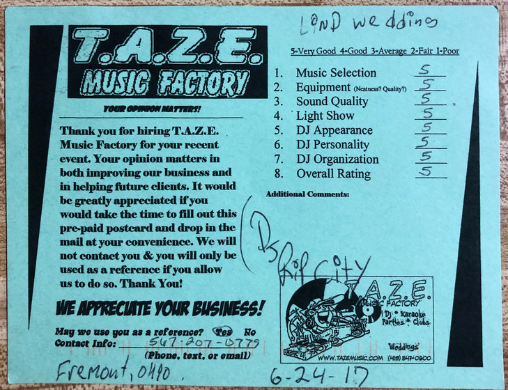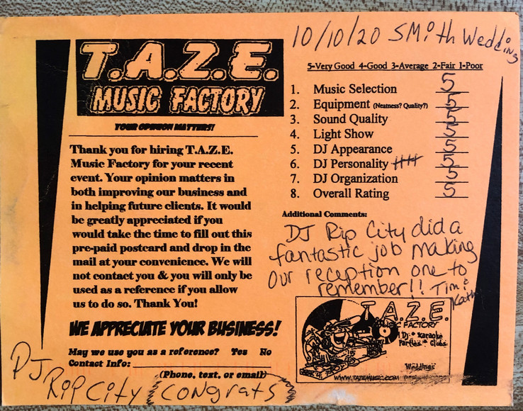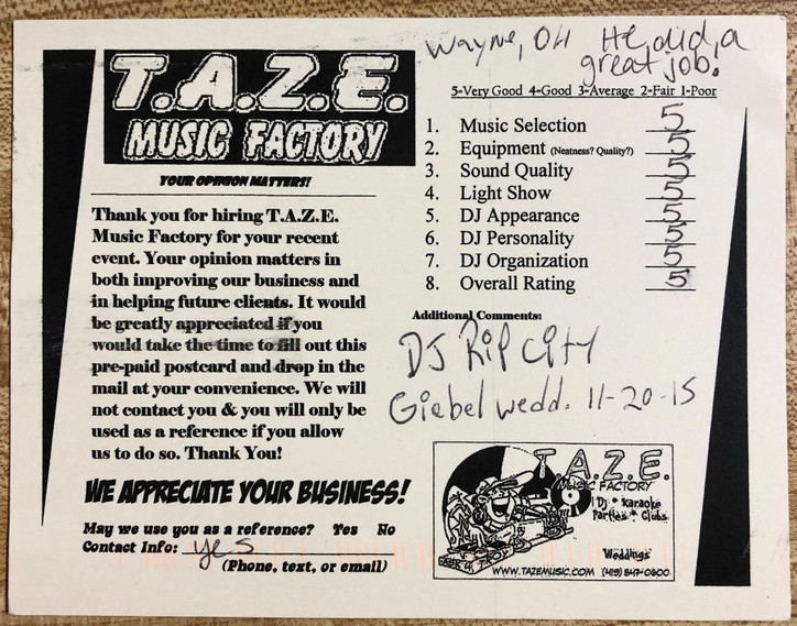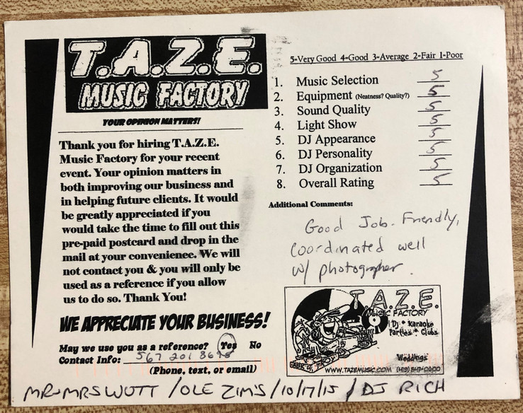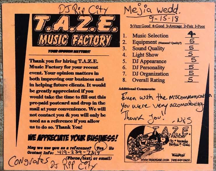 Thanks TAZE Music Factory for saving the day on the most important day of my wife and I’s life. When another DJ service canceled on us the morning of our wedding you were there to save the day!