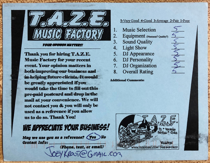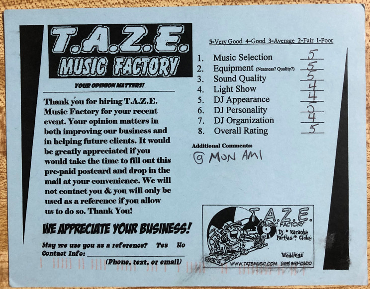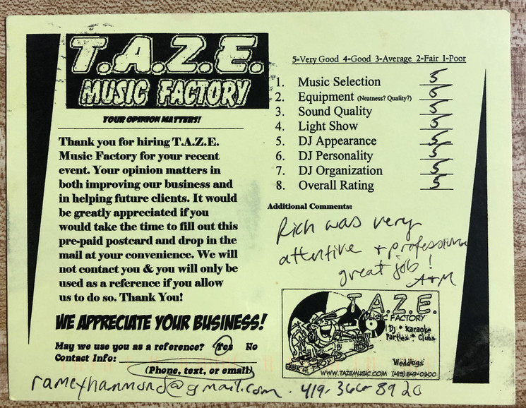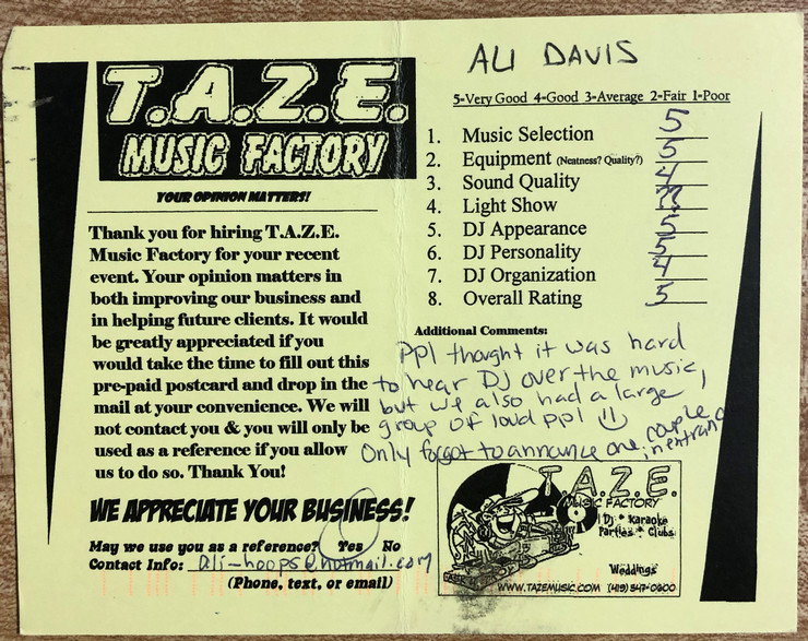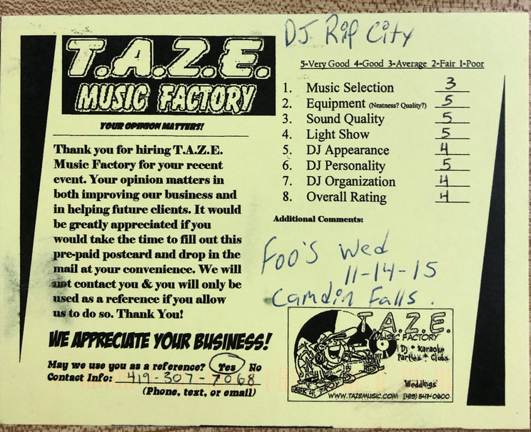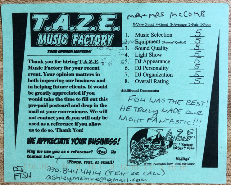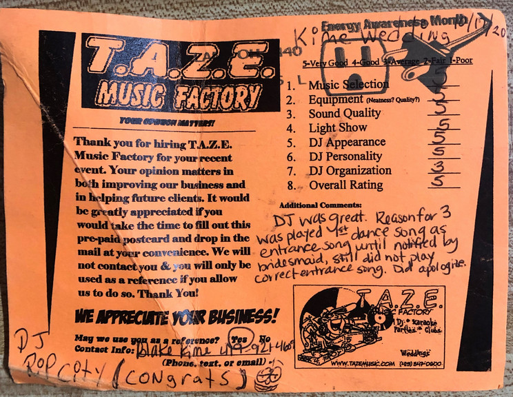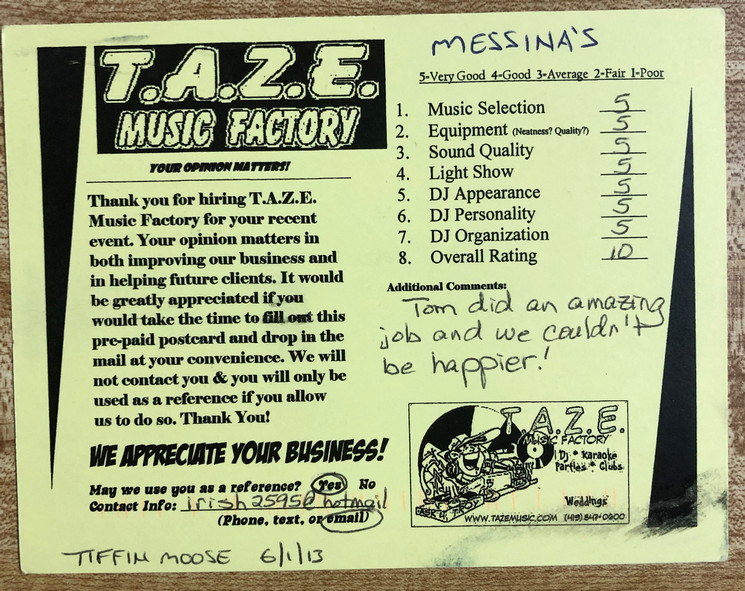 Thanks TAZE Music Factory for saving the day on the most important day of my wife and I’s life. When another DJ service canceled on us the morning of our wedding you were there to save the day!