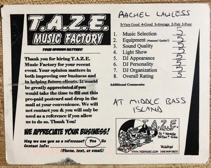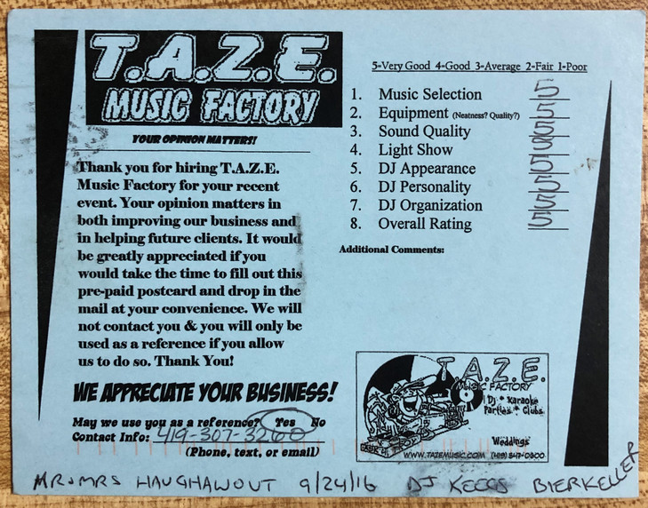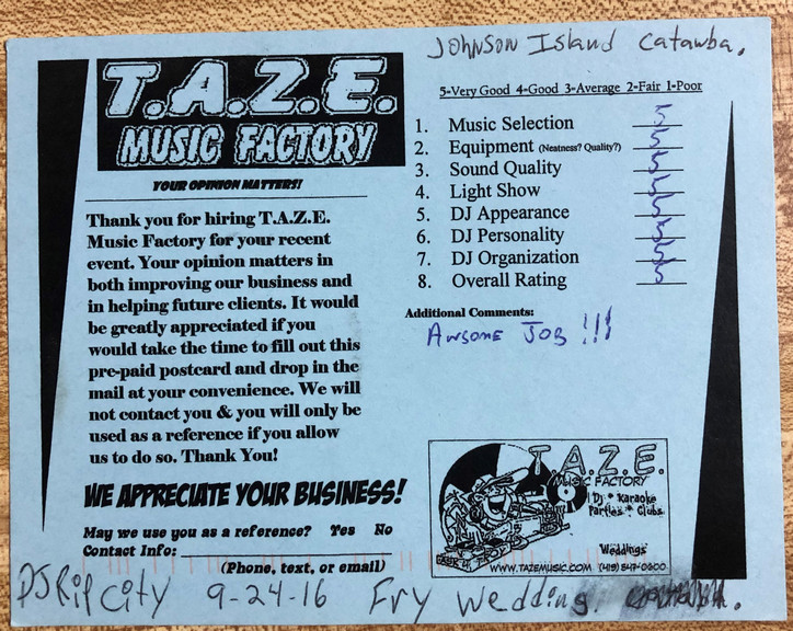 We had DJ Todd for our 6/17/17 wedding in Marblehead and he was fantastic! We decided last minute that we wanted a DJ and TAZE was great and affordable on short notice, which we truly appreciated. Our reception was not the traditional setting as we had it at the Erie Social Shuffleboard Club & Bar, but Todd was great at helping us keep things on track with everything from speeches, dances, and cutting the cake. Music was great and got people out on the dance floor! Would recommend TAZE to anyone looking for well experienced DJ service! Thanks again!!