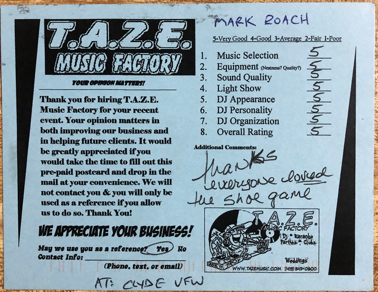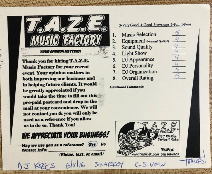 I have used TAZE DJ services for the past three years at an annual banquet. They do a phenomenal job and are very easy to work with. T.A.Z.E. DJ Service has a lot to ofer and always takes our banquet to the next level. I would not hesitate to recommend Troy and T.A.Z.E. Music Factory to anyone!